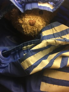 It seemed a very big place when you were a small blonde bear and trying to hide. But by following the big brick wall, finally Abigail could see a way out. Her ears lifted, she was sure she could find out where she was. But she didn’t know how she could get home. Carefully she looked around the corner. Sitting on a bench under a bright light were two people, with a dusty striped blue and white bag on the floor beside them. They were talking very loudly.