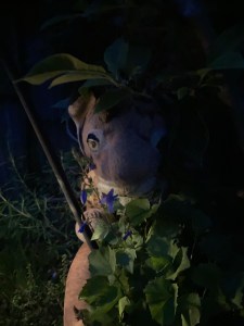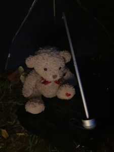 Abigail wasn’t a happy bear. In fact she was a very unhappy bear. She didn’t like the rain. Or the dark. Or being outside and hiding behind the shed. She wanted to be inside in her bed. With a cake. They sat on a plastic blanket, an umbrella above them against the side of the shed and their bags and boxes behind them. But it wasn’t very comfy. There must be a lot of stones under the blanket and Abigail kicked at it.