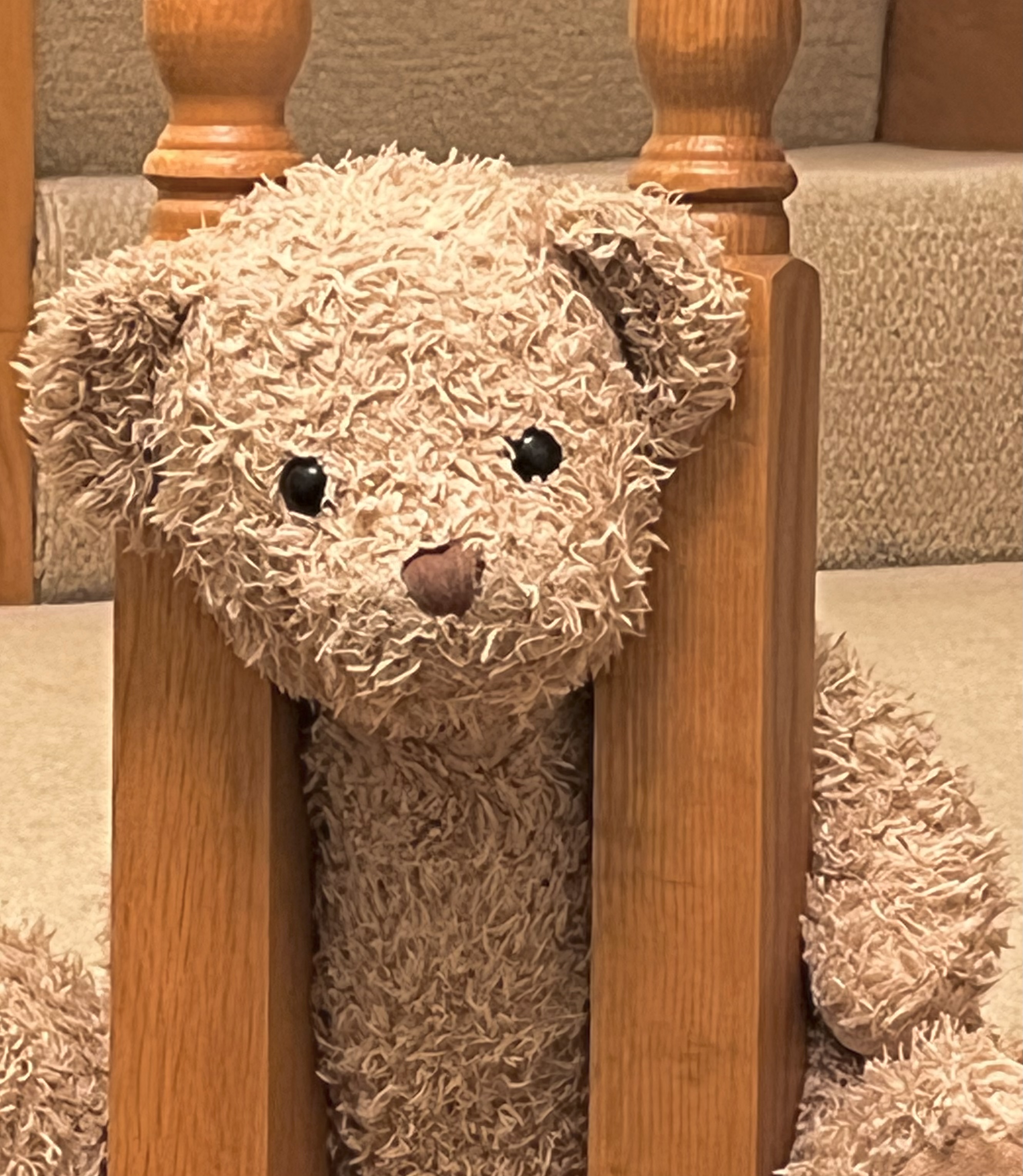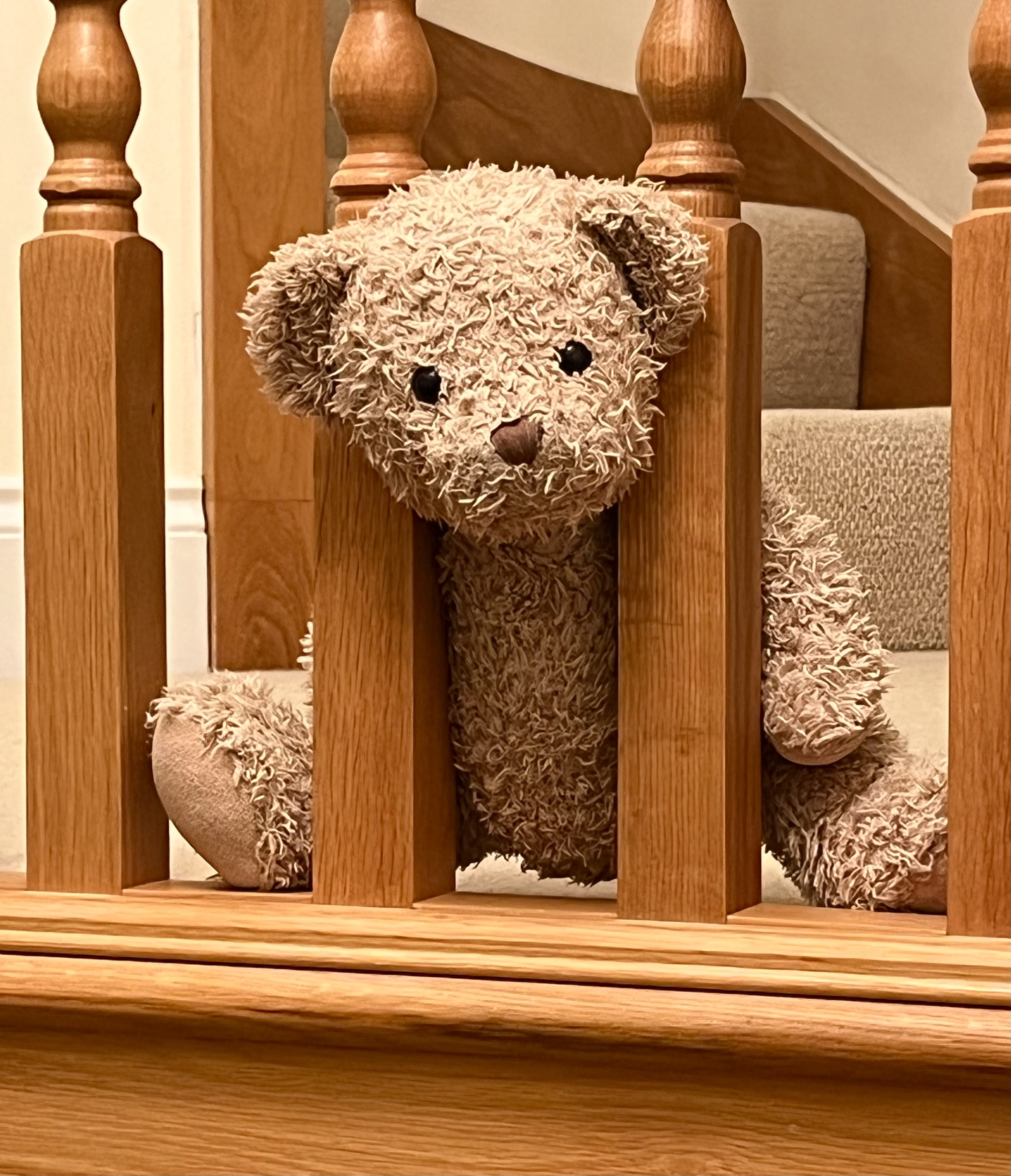She really didn’t need to tidy her room. Her pink Christmas tree was on the shelf, her cover was on her bed and the bag pushed underneath it. She was a very neat bear. It was true that her marbles were on the floor, but she’d been admiring their lovely sparkly colours. The green and blue ones were her favourites. Picking one up in her paw she rolled it around. It felt smooth and cool and she held it up to the light. Dropping it back down onto the floor, with a flick of her paw, she threw it along the carpet and it shot out of the door. There was a loud crack. It must have gone right down the stairs, she hoped it hadn’t broken, it was one of her favourites. Jumping up and scampering out of her room she looked through the bannisters, she couldn’t quite see it. Pushing her head through the wooden posts she looked down. There it was! It seemed to be all right. She pulled her head back. Nothing happened, her ears seemed to be in the way. She pulled harder. ‘Ow…’ Twisting around she tried to put her head on one side. Stupid bannisters! Pushing her paws against them she tried again. No… she seemed to be… ‘I’m stuck!’ she called. ‘Are you there?’